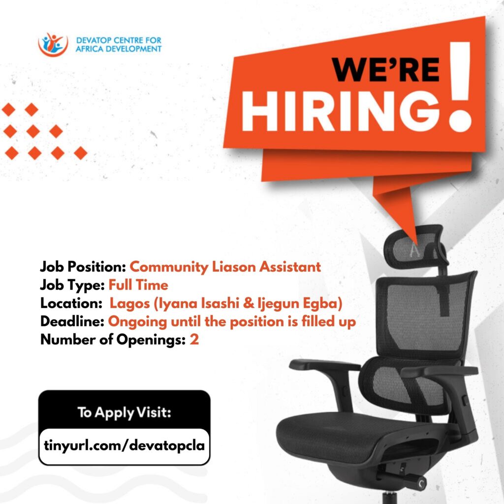 The Community Liaison’s primary function is to oversee the implementation and monitoring of Devatop’s activities within their communities in Lagos state, ensuring implementation schedules are met as per the detailed activity plan. That adherence to systems for quality project implementation is strengthened. This will include helping to shape and direct the organisation’s work in championing the rights of children as well as engaging with stakeholders to achieve set objectives.