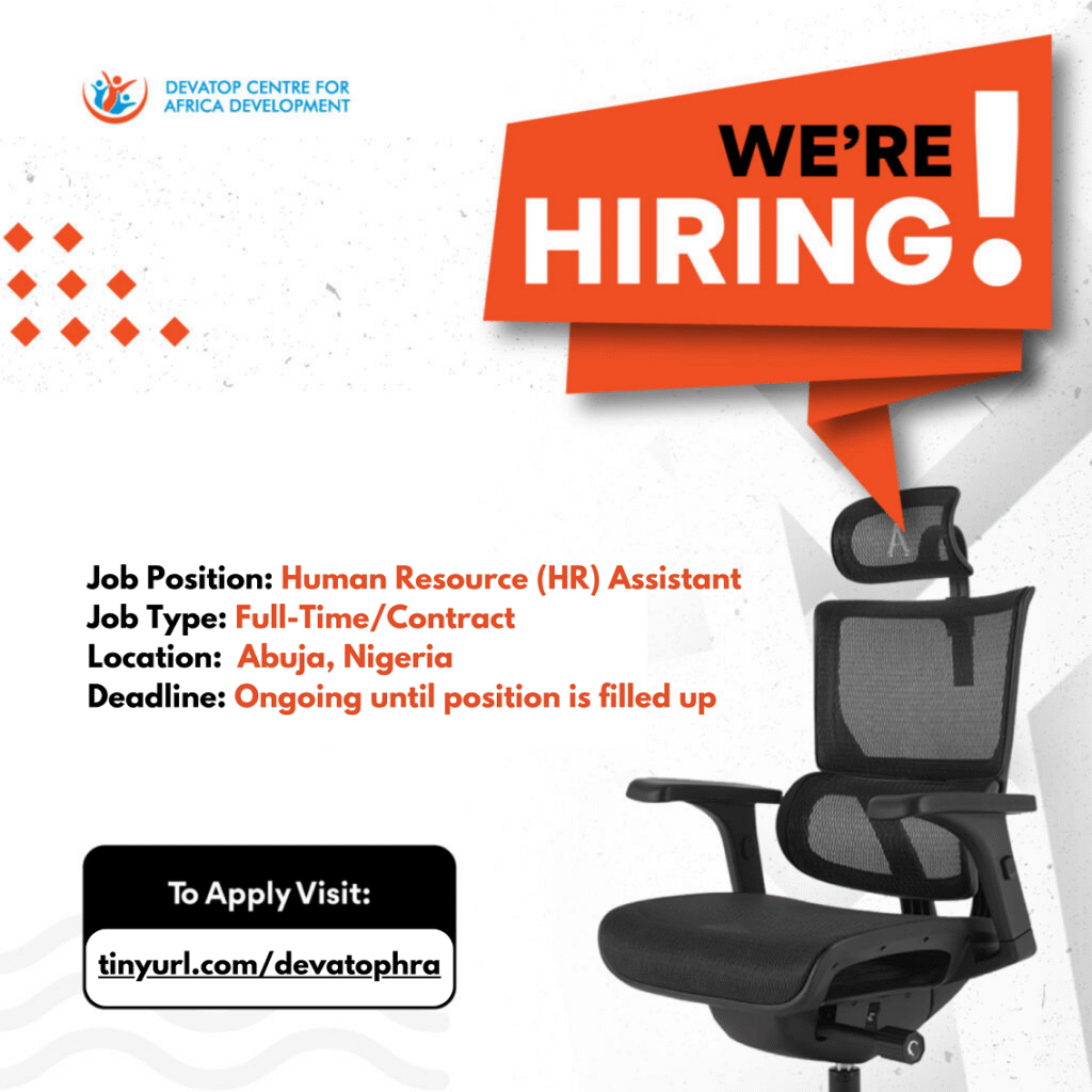 The HR Assistant will support the coordination of the Human Resources Department at Devatop Centre for Africa Development. This role is designed for a proactive, detail-oriented individual who can handle essential HR tasks efficiently while the organization operates with limited resources. The HR Assistant will ensure smooth HR processes in recruitment, staff records, staff development, performance support, and staff welfare.