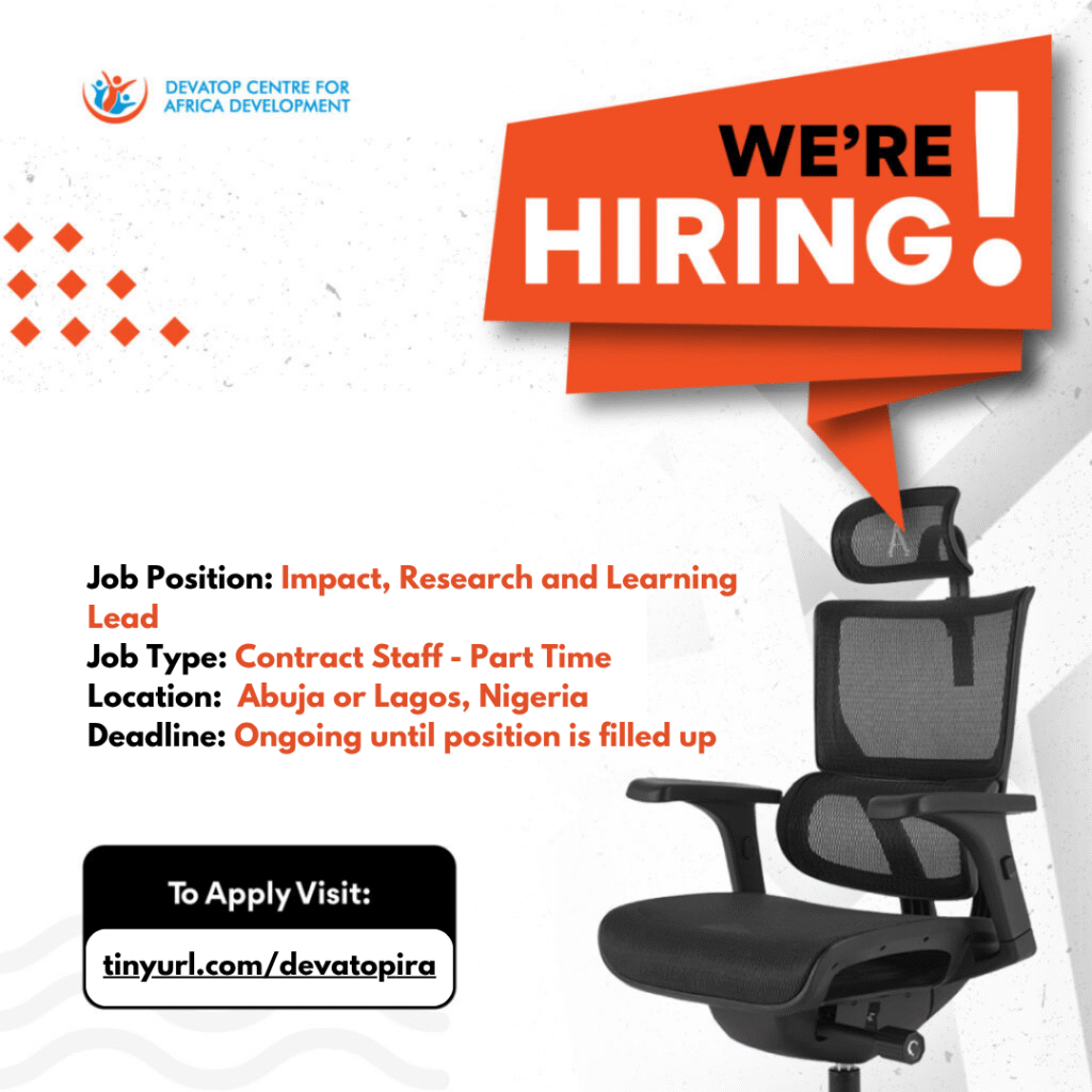 Devatop Centre for Africa Development is seeking a qualified Impact Research and Learning Coordination Lead to support its monitoring, evaluation, research, and learning activities. This short-term engagement will focus on strengthening evidence generation, impact measurement, and organizational learning to improve program effectiveness and accountability.