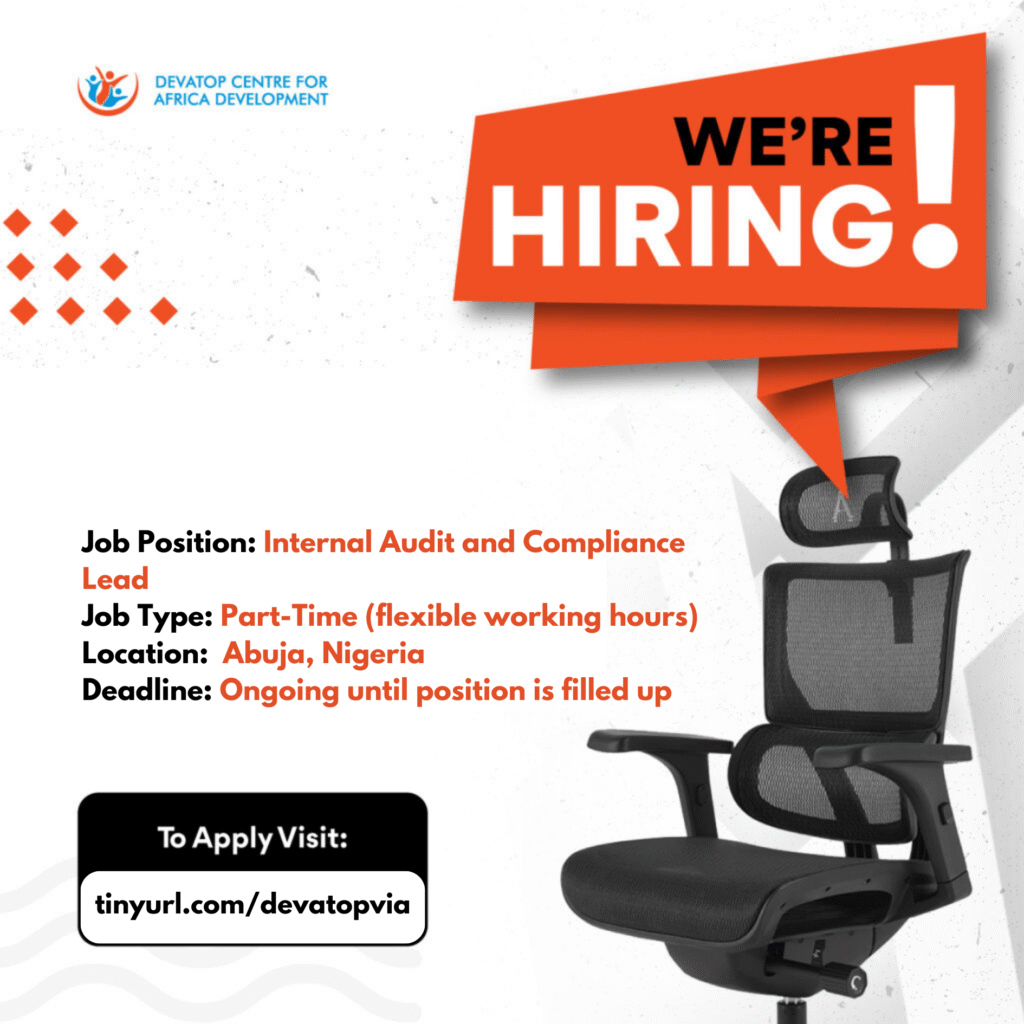 Devatop Centre for Africa Development is seeking a detail-oriented and highly professional individual to serve as our Internal Audit and Compliance Lead on a part-time basis. This role is critical in ensuring transparency, accountability, compliance, and efficiency in our operations. The successful candidate will provide independent and objective assurance, evaluate internal controls, and strengthen compliance with policies, donor requirements, and statutory regulations.